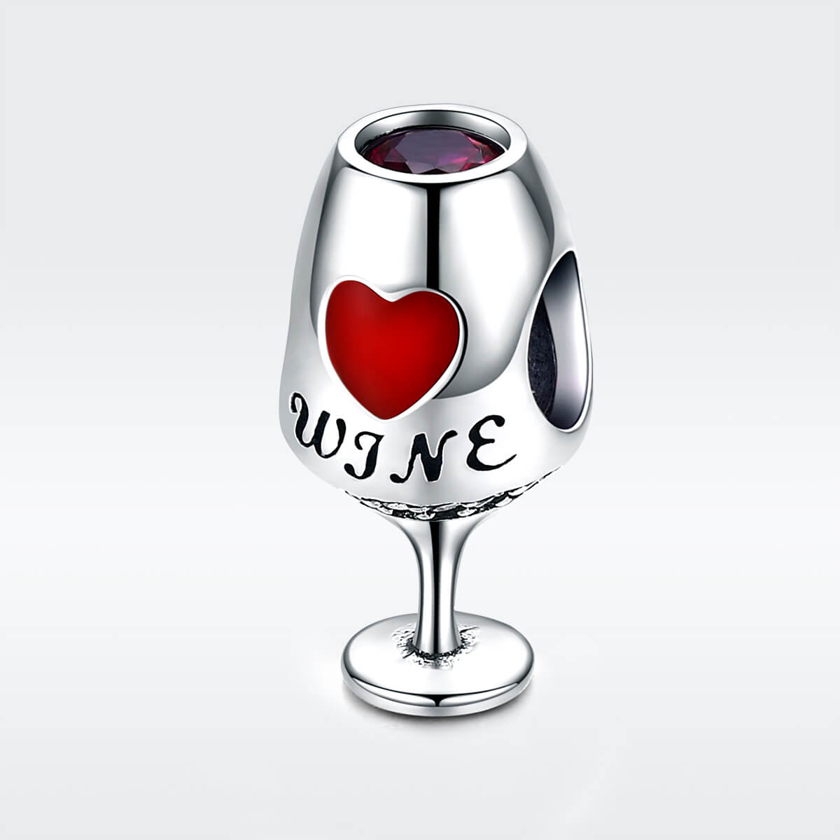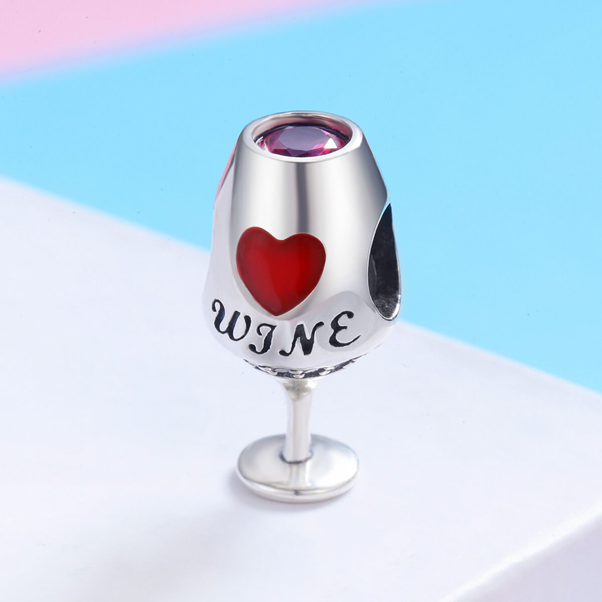 Boros pohár formájú ezüst charm közepén egy piros szívvel. Mindazoknak akik szeretik egy hosszú nap után egy pohár bor kíséretében levezetni a nap fáradalmait. Tökéletes kiegészítője lehet charm karkötődnek vagy nyakláncodnak.
