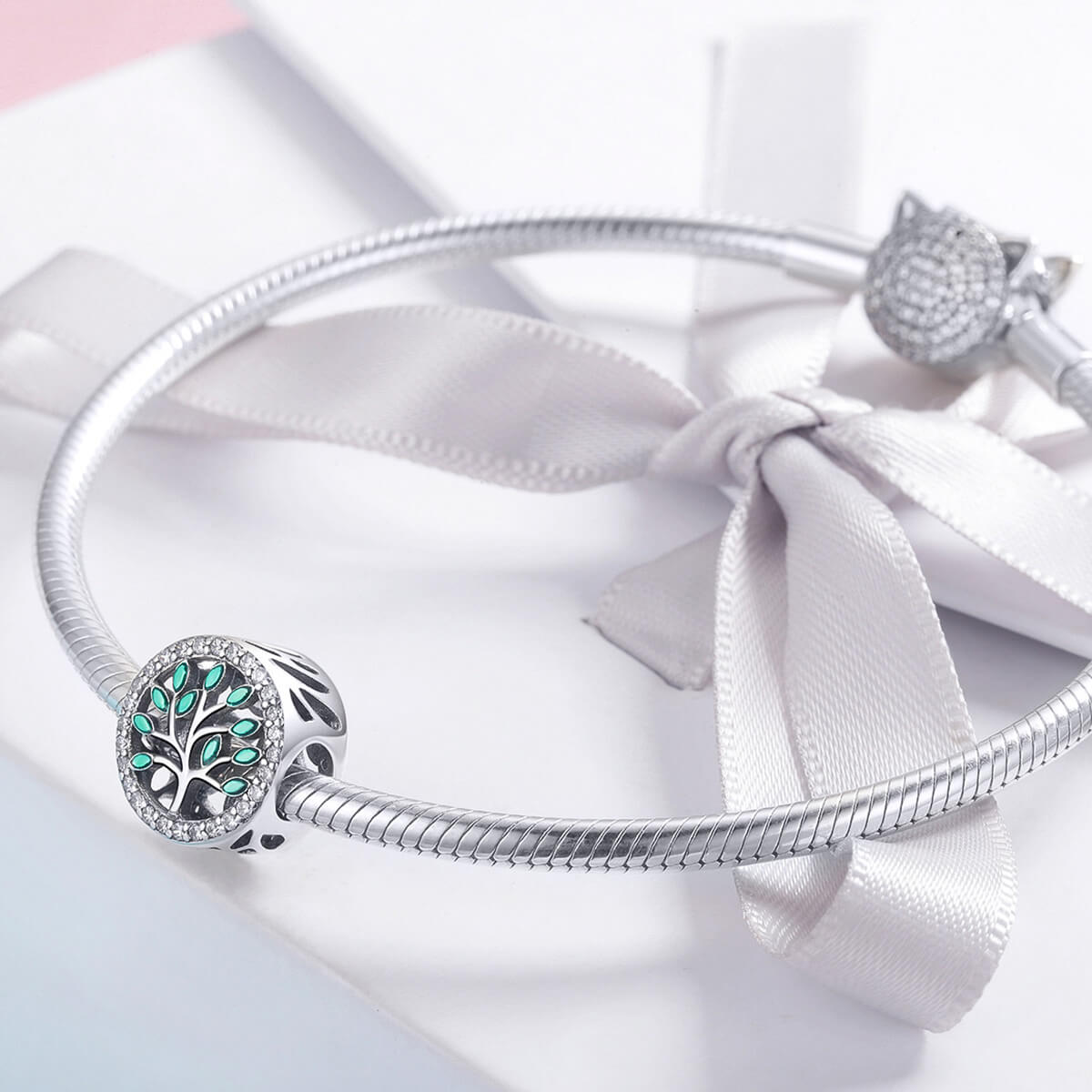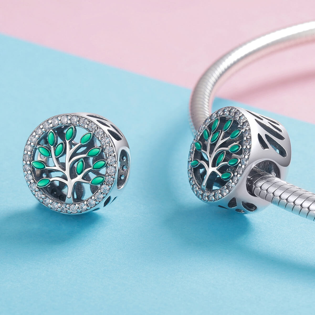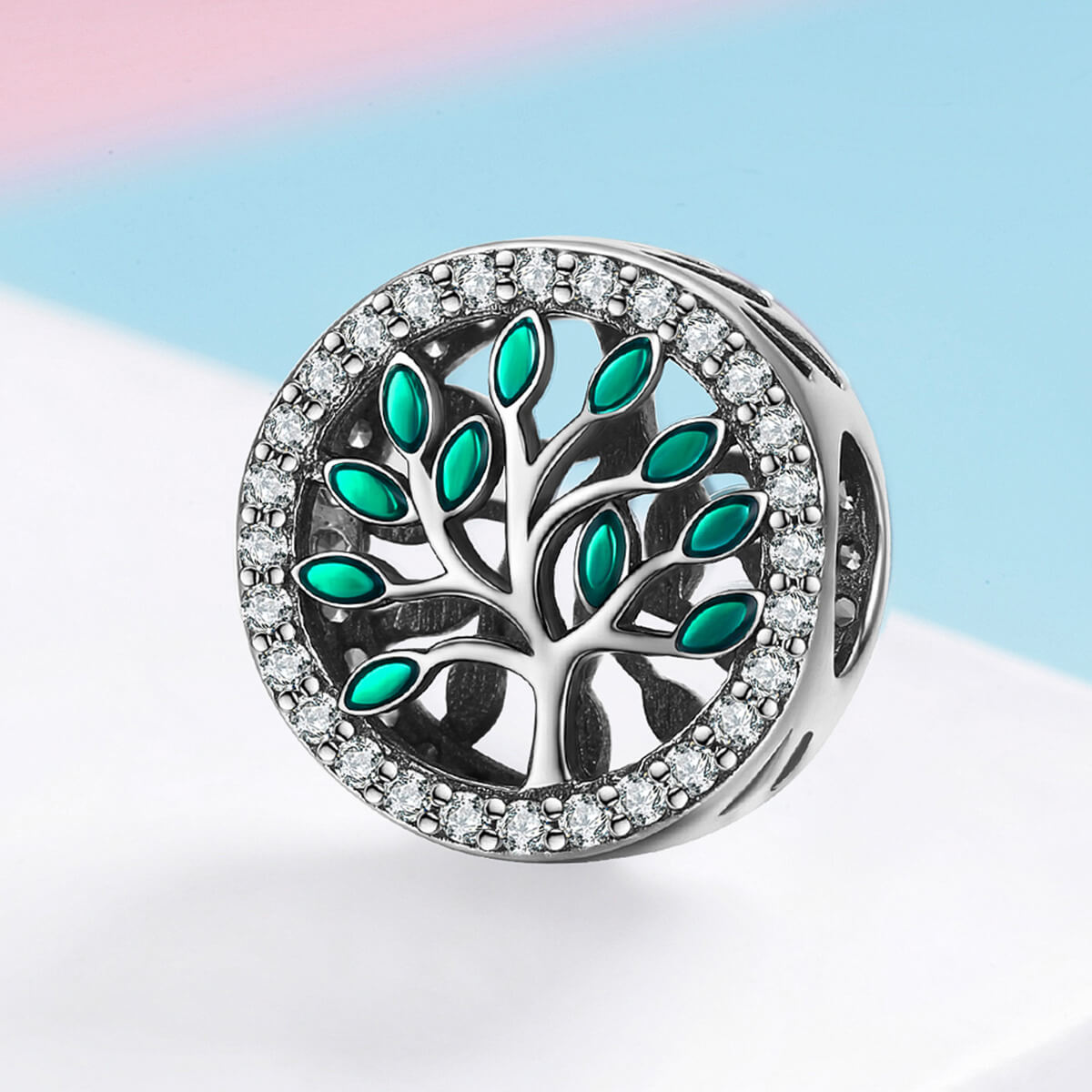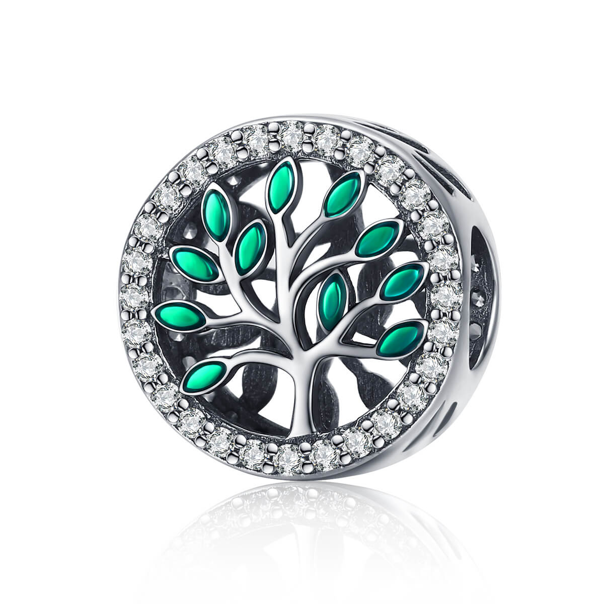 Az életfa a születés szimbóluma, ezért szimbolizálja a termékenységet. Gyönyörű zöld életfa csillogó cirkónia kristályokkal díszítve. Tökéletes kiegészítője lehet charm karkötődnek.