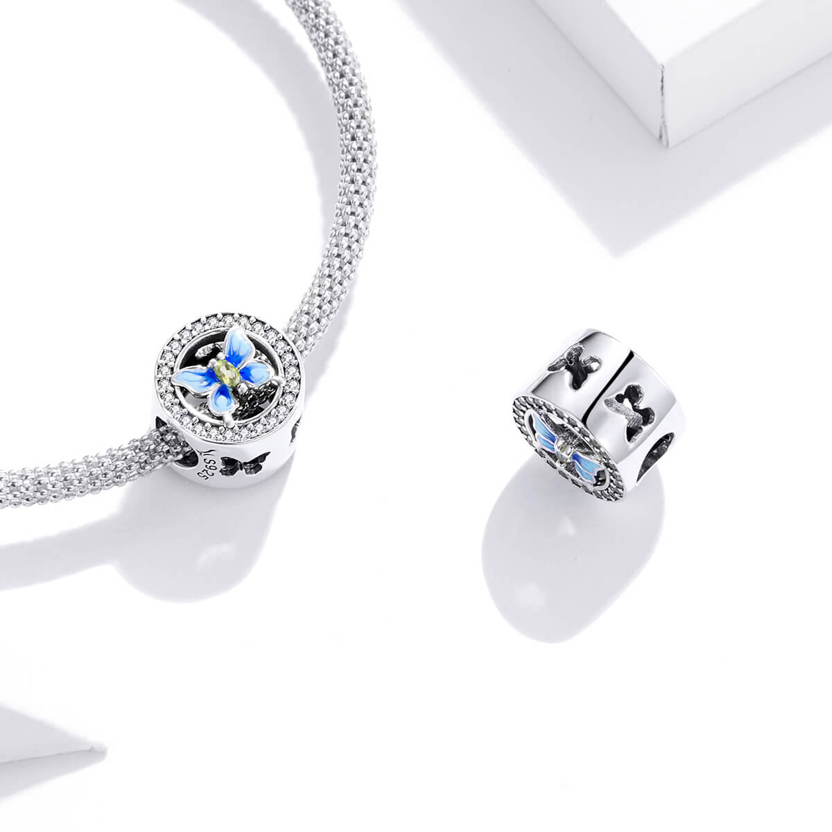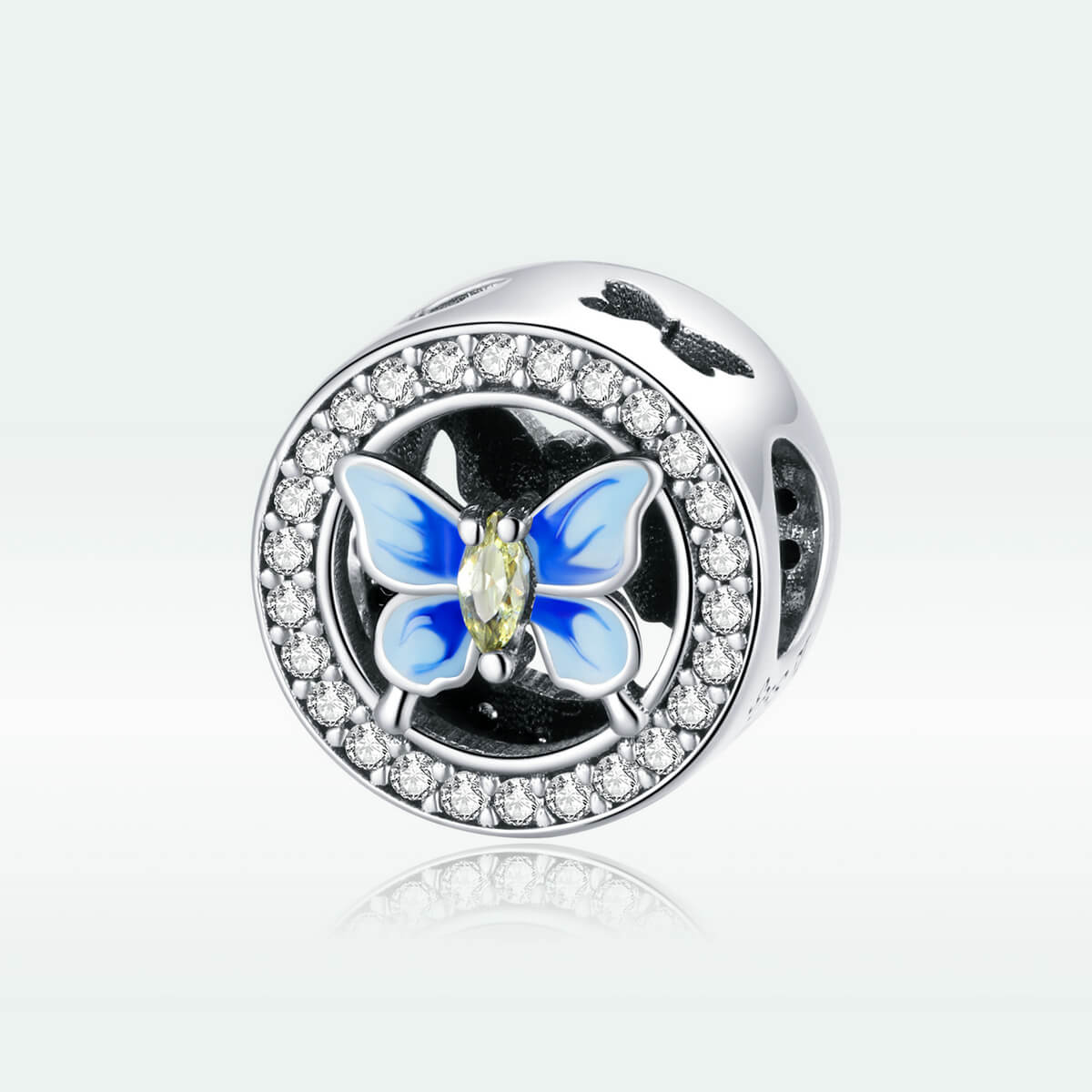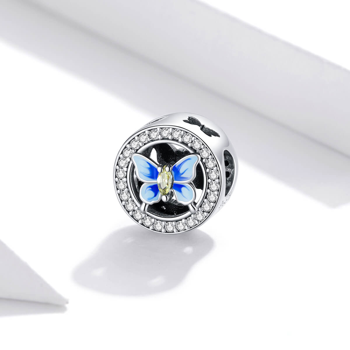 Csillogó cirkónia kristályokkal körbevett kék pillangó. Tökéletes kiegészítője lehet charm karkötődnek.