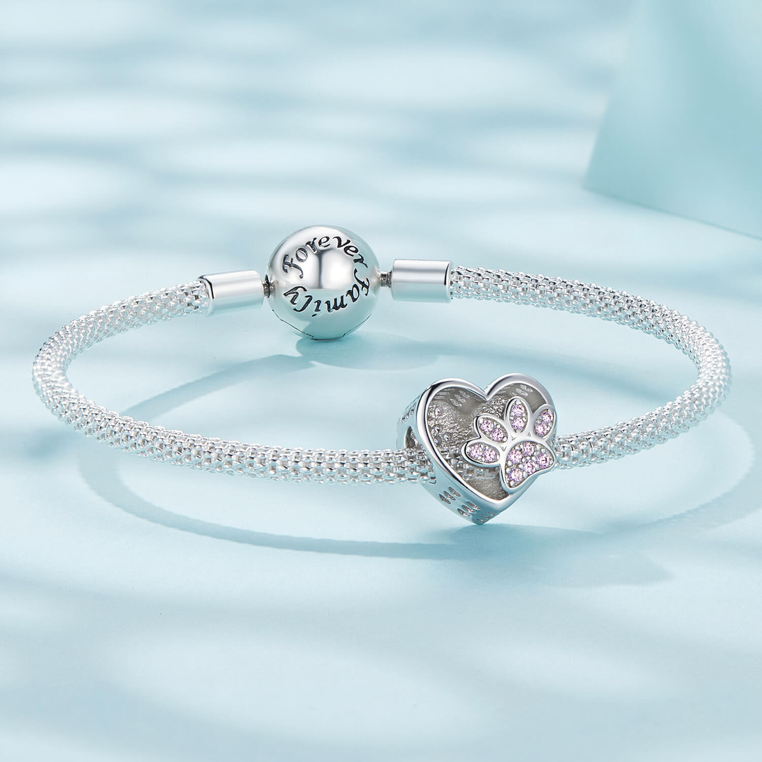 Gyönyörű rózsaszín cirkónia kristályokkal van díszítve ez a cuki kis mancsnyomat. Minden kisállat szeretőnek nagyszerű választás. Tökéletes kiegészítője lehet charm karkötődnek.