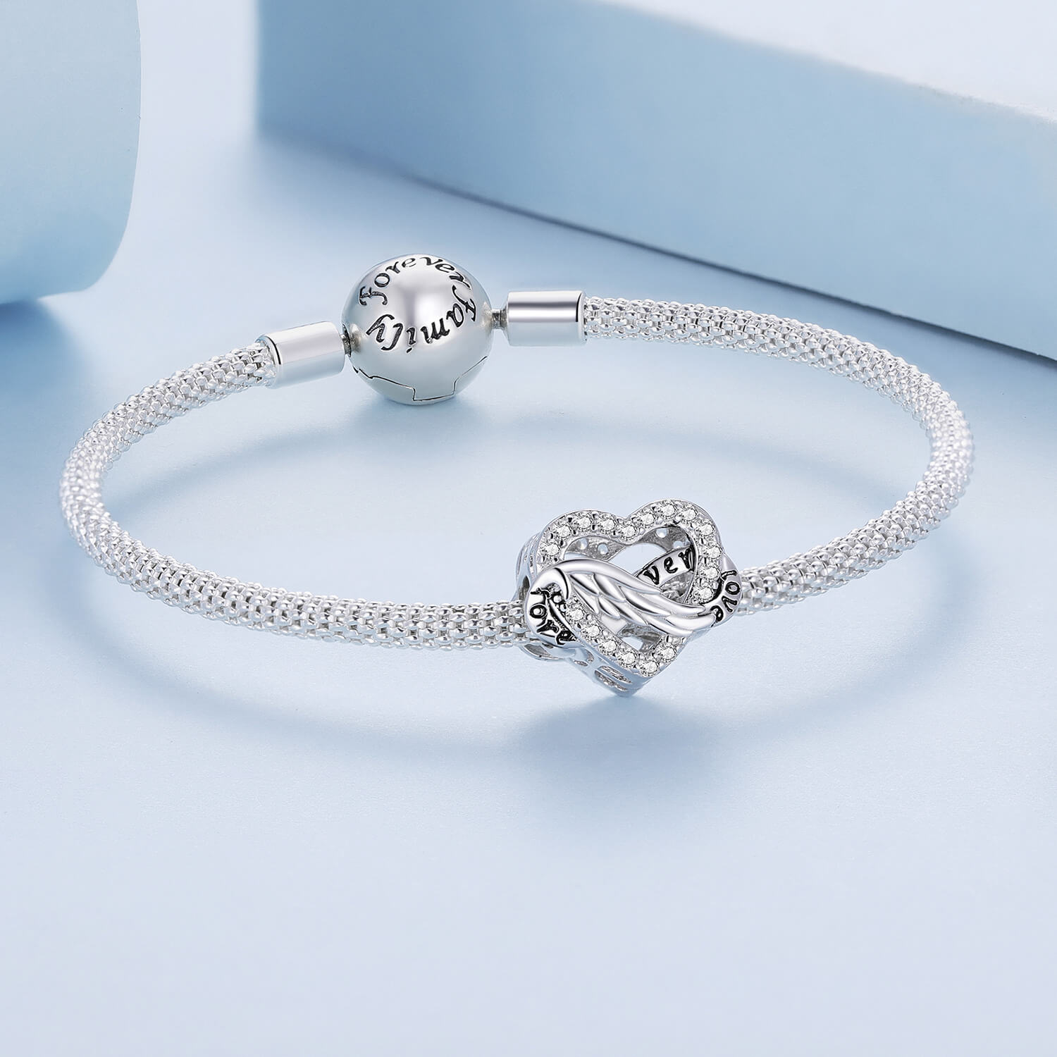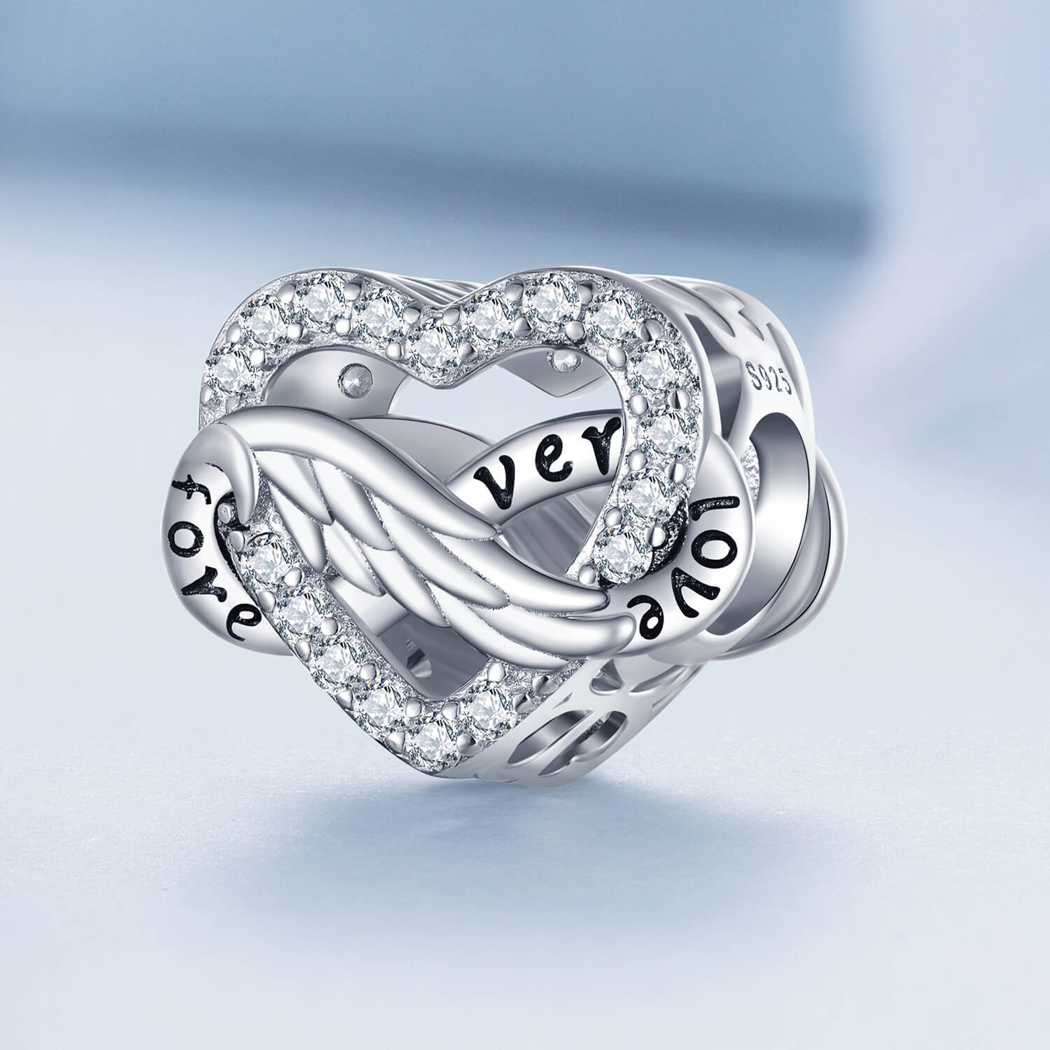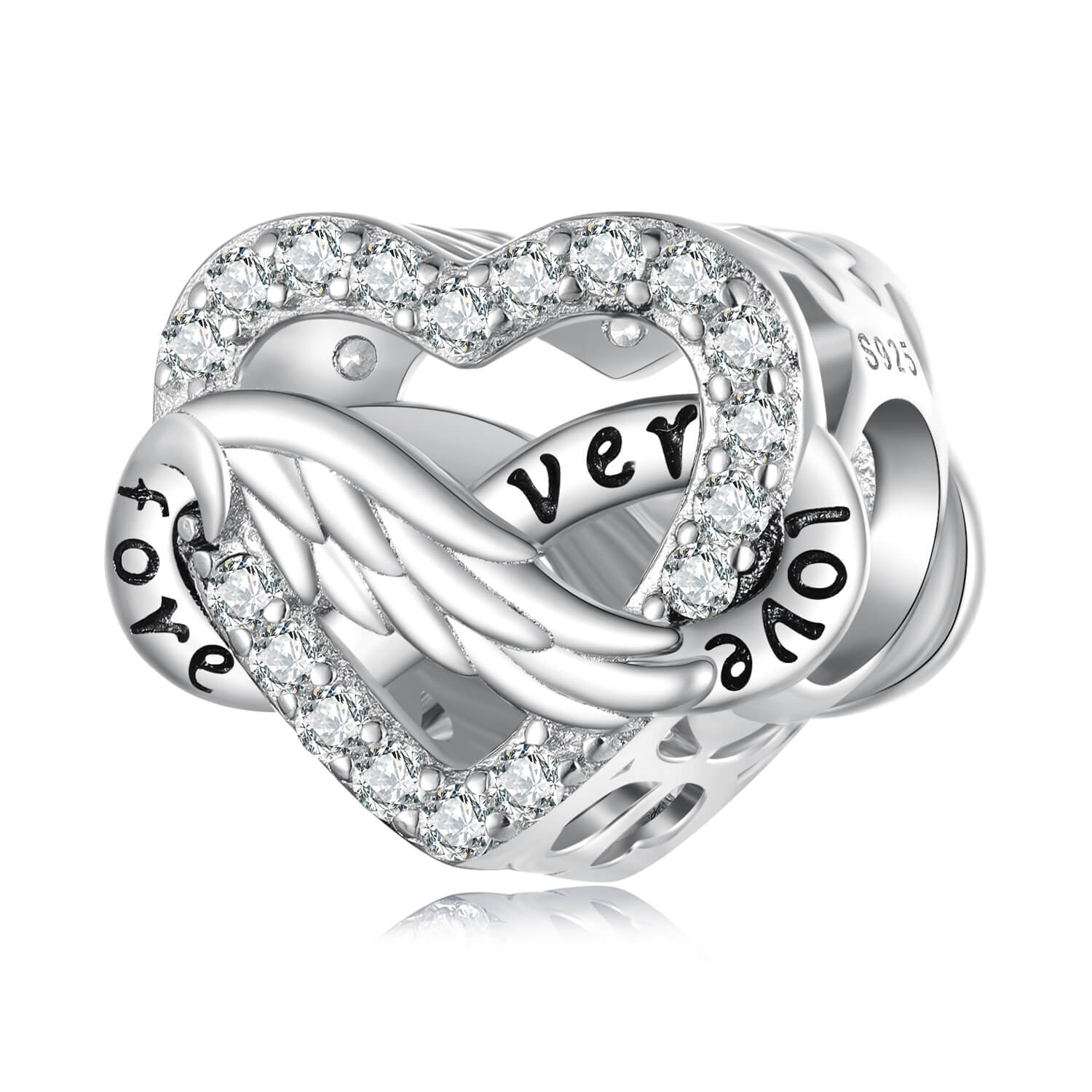 Különleges szív, melyben egy angyalszárnyas végtelen jel helyezkedik el. Gyönyörűen csillogó cirkónia kristályokkal díszítve. Tökéletes kiegészítője lehet charm karkötődnek.