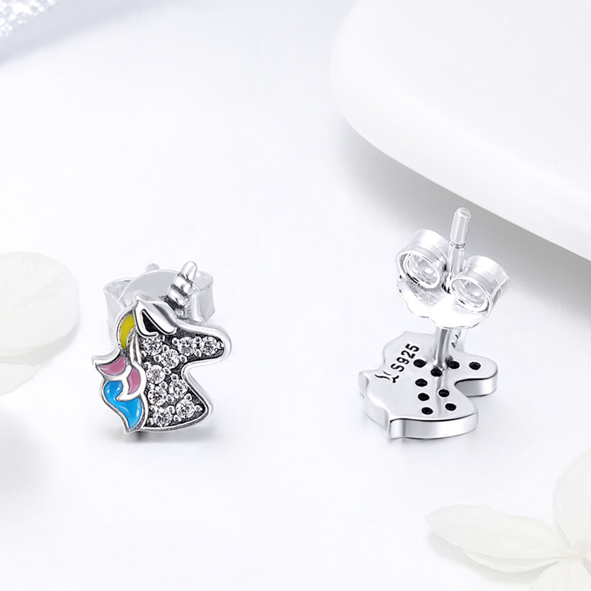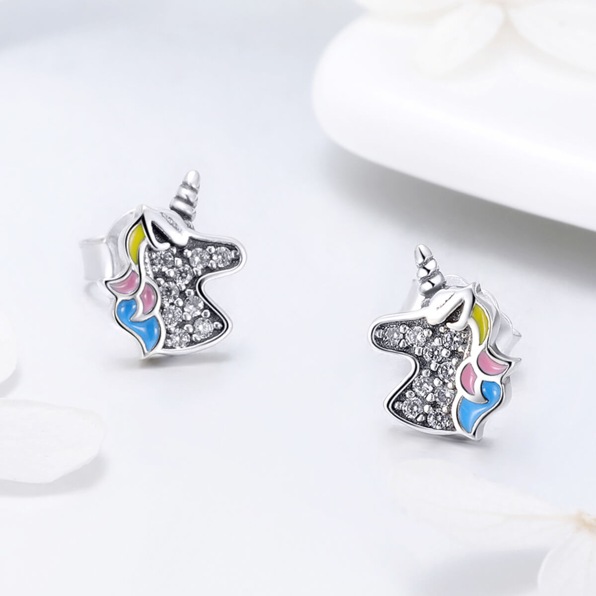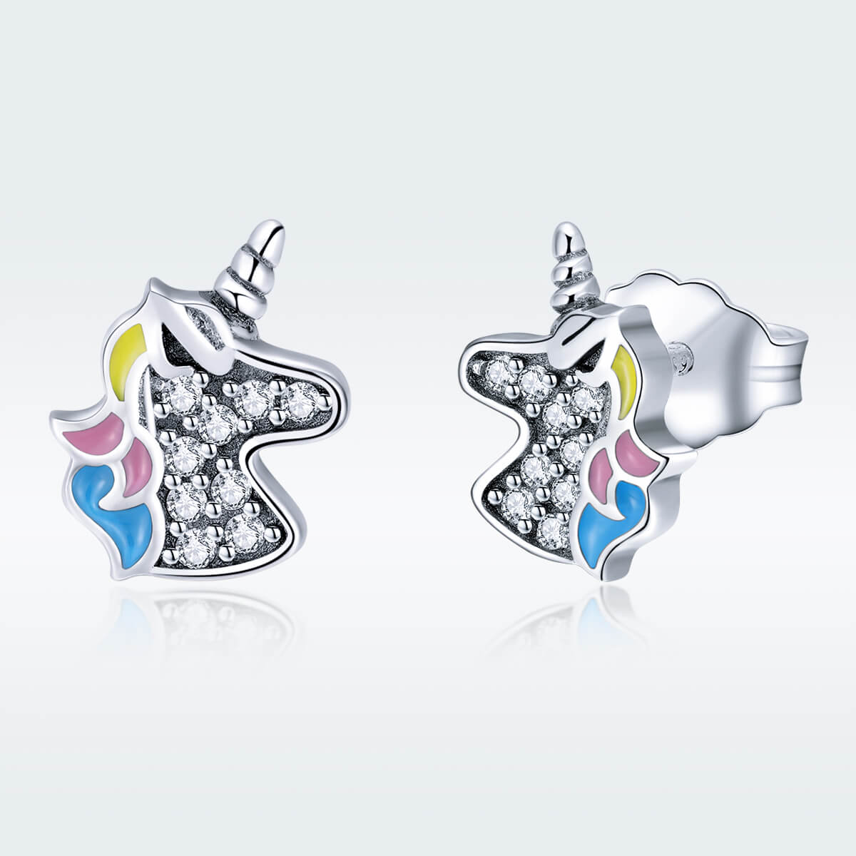 Színes kis unikornis ezüst cirkónia kristályokkal díszítve.