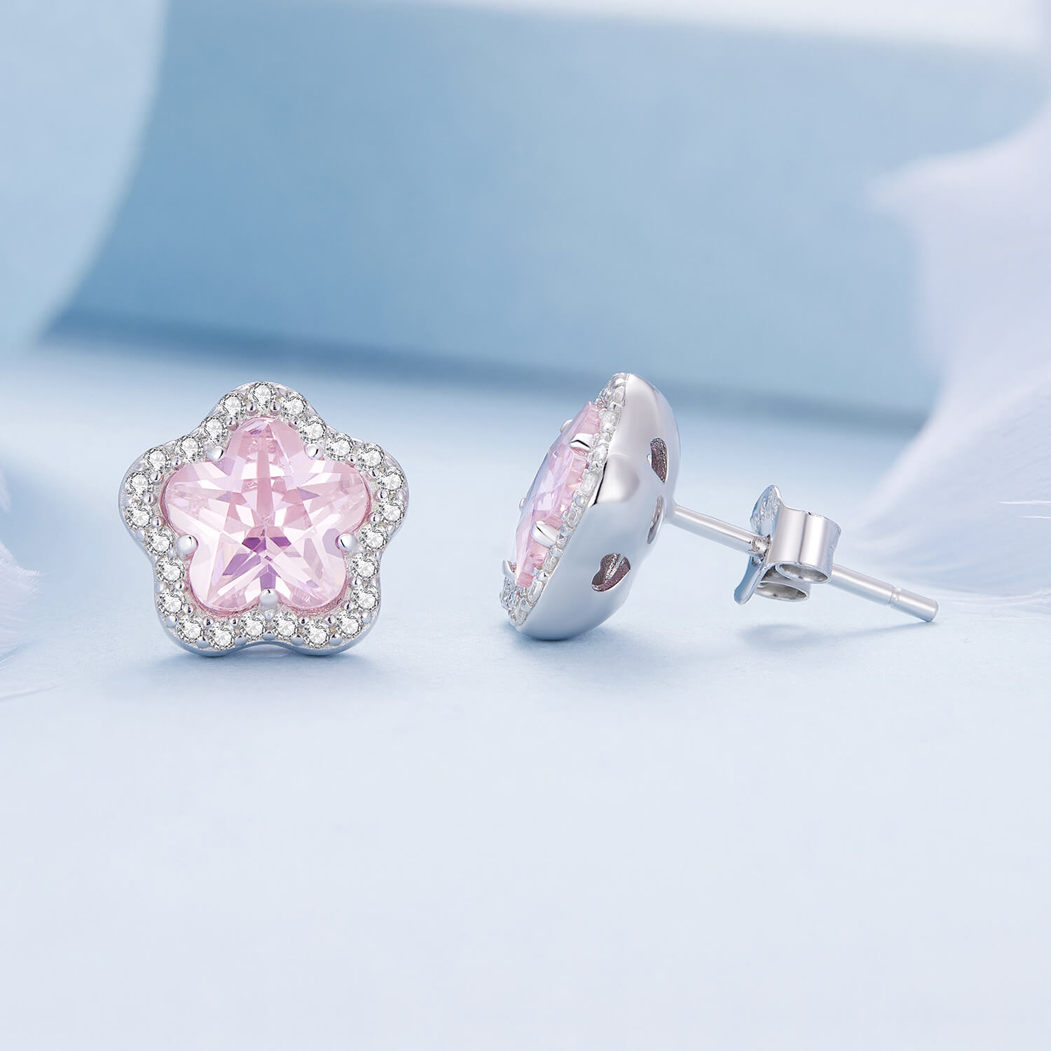 Csillogó rózsaszín virág ezüst cirkónia kristályokkal díszítve.